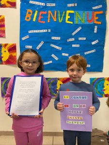 Après un temps de récréation, 2 élèves des écoles respectives se sont échangé les albums de classe de manière officielle. Ils ont lu leur fiche d’identité.