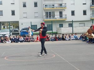 Suite à cette petite marche, sous le soleil, tout le monde s’est retrouvé sur la cour pour déguster la traditionnelle crêpe en profitant des talents de jonglerie de Gwénolé