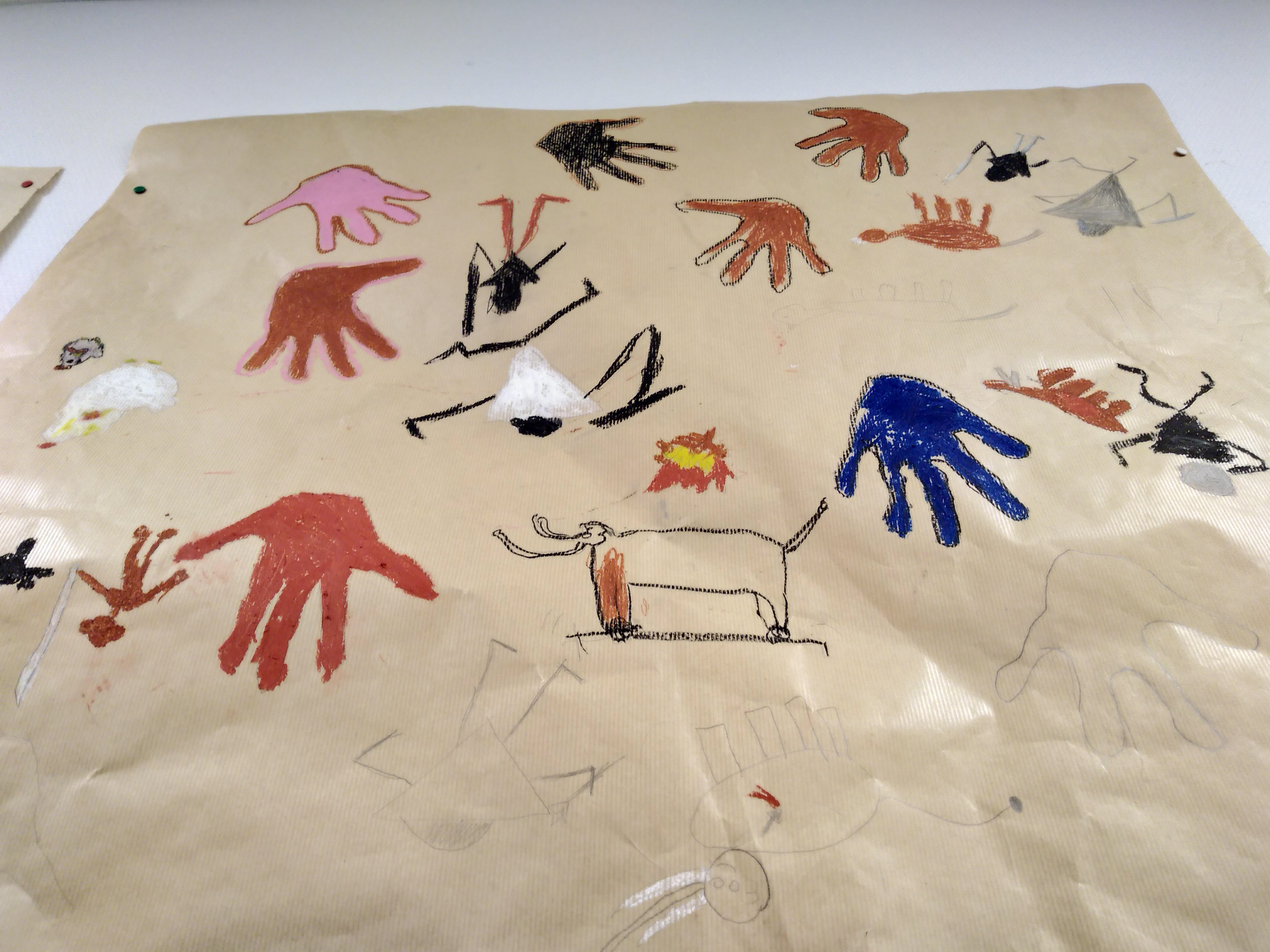 L’occasion pour eux de s’essayer aux peintures rupestres pour transformer le couloir en véritable grotte préhistorique mais aussi de confectionner de la peau de dinosaures avec de la tapisserie, des pastels et de l’encre.